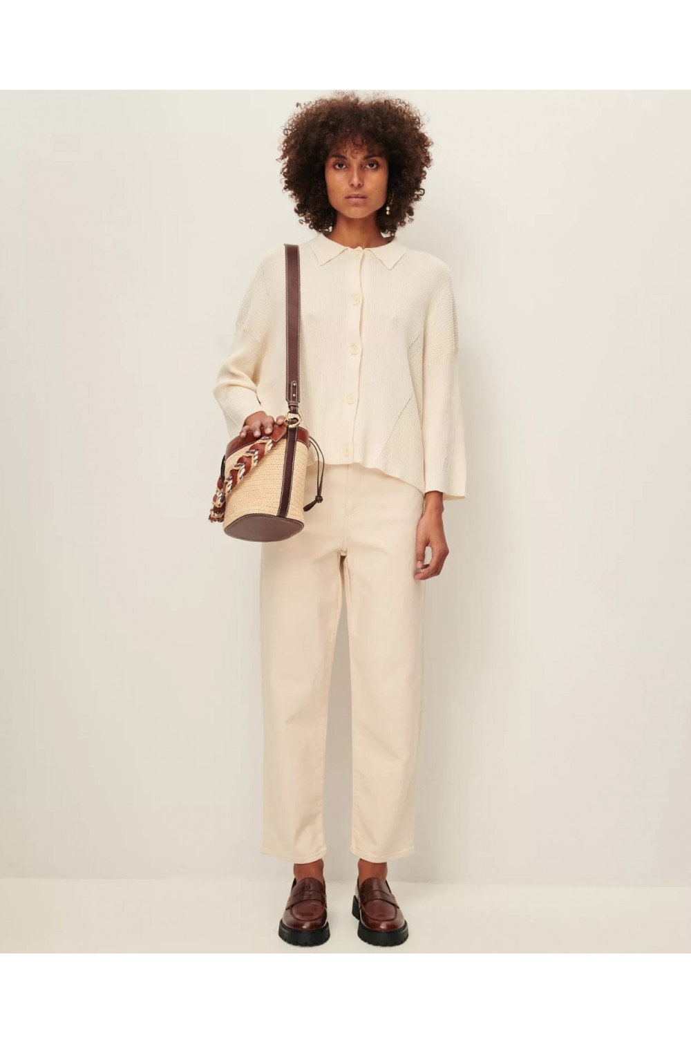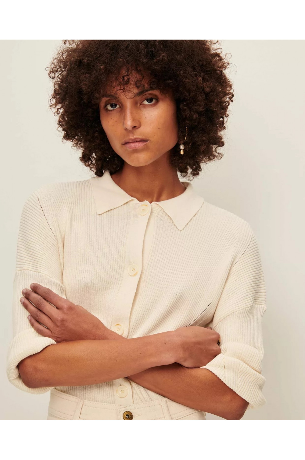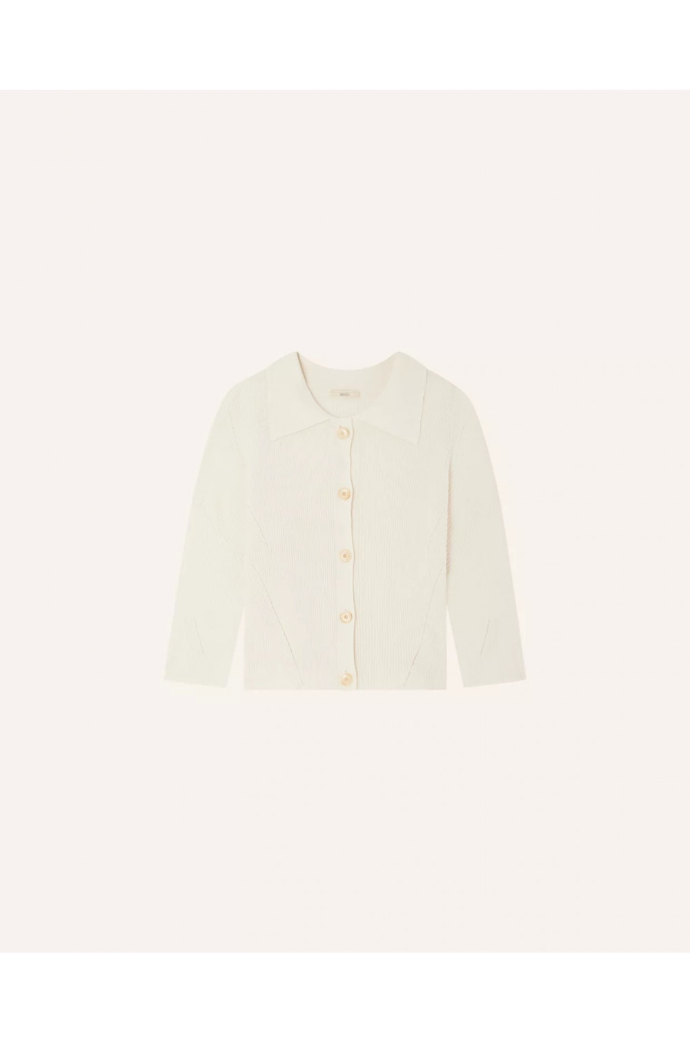 Fermeture boutonnée devant dont un bouton bijou au pied de col.