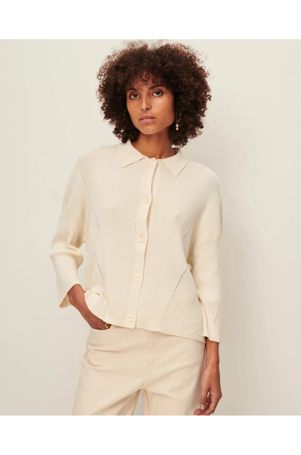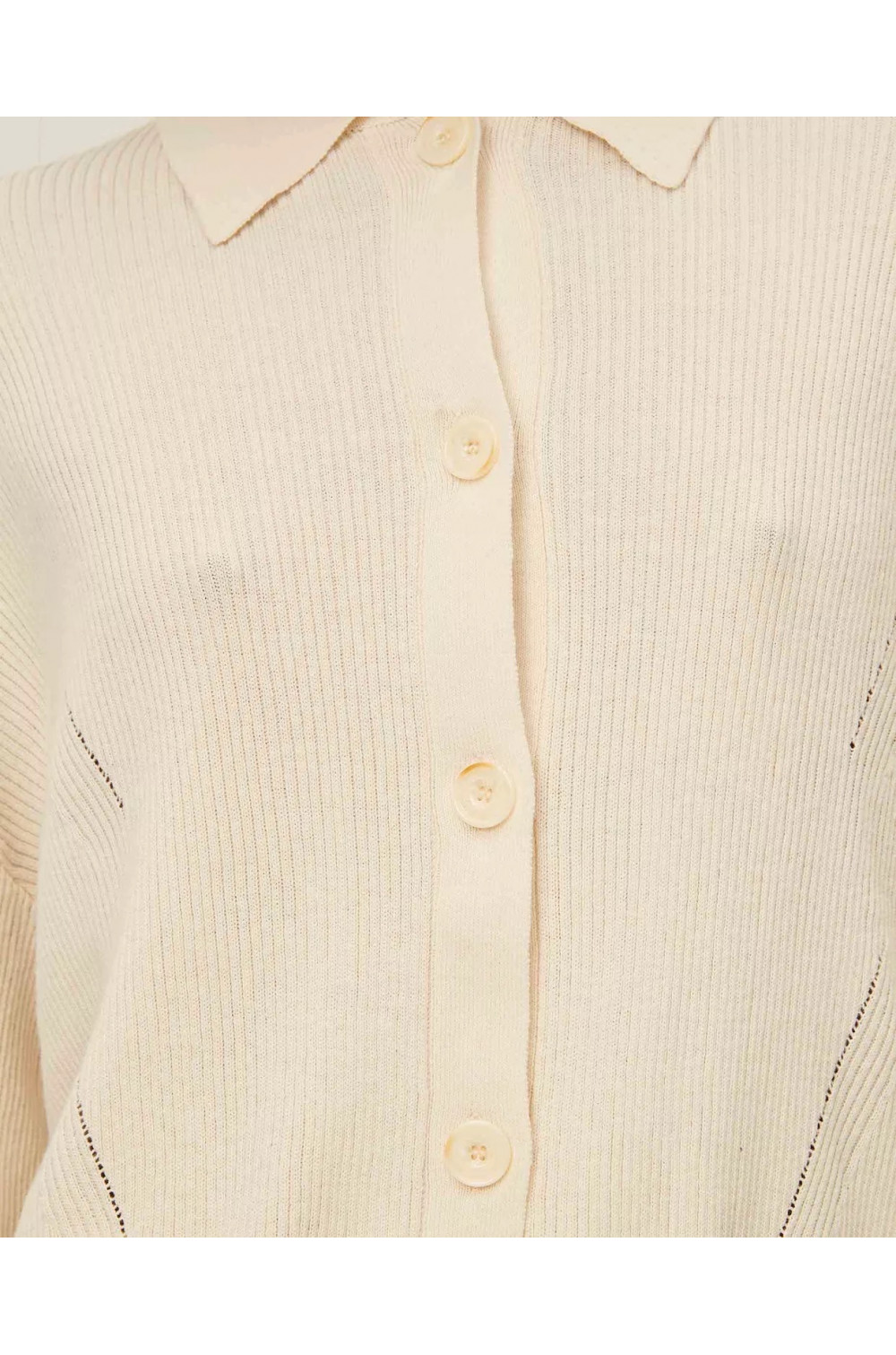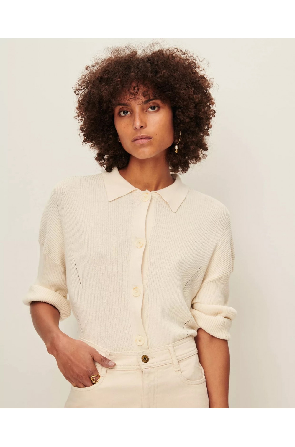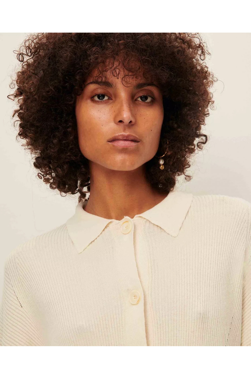 Fermeture boutonnée devant dont un bouton bijou au pied de col.