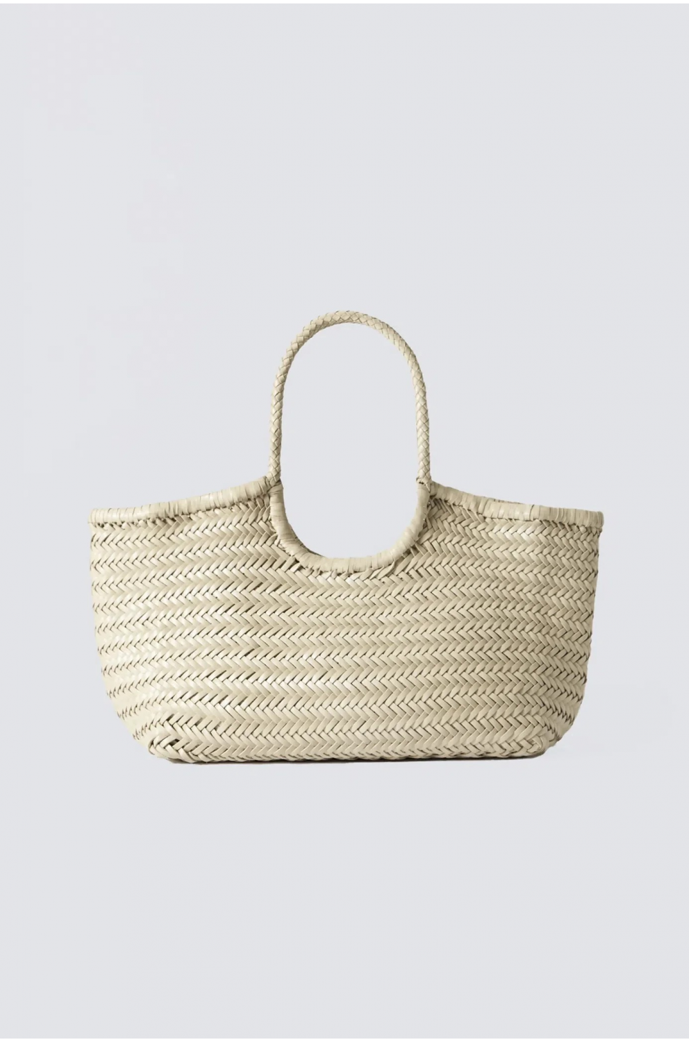 Panier en cuir tressé couleur craie. Deux anses. Non doublé.