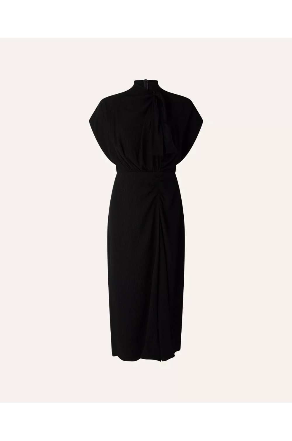 Robe longue à col lavallière, froncée et fendue devant, en crépon uni double seersucker.